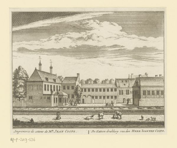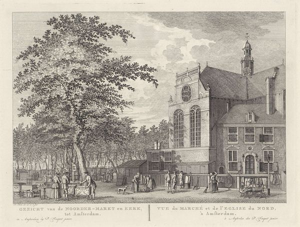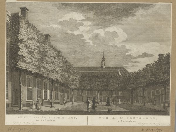 This print, titled "Gezicht op de Grote Synagoge te Amsterdam," was made anonymously using etching techniques. The image is defined by the crisp, precise lines created through this printmaking process. An etcher covers a metal plate with a waxy ground, then scratches away lines to expose the metal. The plate is then immersed in acid, which bites into the exposed lines, creating grooves. Ink is applied to these grooves, the surface wiped clean, and the image transferred to paper under high pressure. Consider how this method of production—requiring technical skill and multiple steps—mirrors the detailed architecture it depicts. The act of etching, with its careful labor, emphasizes the cultural significance of the subject. This print preserves a moment in time, reflecting the social and physical landscape of Amsterdam. It is a delicate balance of artistry, labor, and cultural documentation.