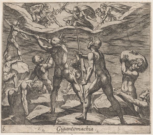 Antonio Tempesta created this engraving called 'Amor schiet zijn pijl naar Pluto' sometime between 1555 and 1630. The composition teems with energy, as the figures of Amor, Pluto, and Proserpina are caught in a dynamic interplay of gazes and gestures, framed by swirling waters and turbulent skies. Tempesta's use of line is particularly striking. The lines are not merely descriptive, but create a sense of movement. The dense hatching and cross-hatching create tonal modulations suggesting depth and volume. The texture of the water is almost palpable, while the billowing clouds seem to writhe with inner life. The scene's semiotic richness lies in its engagement with classical mythology, in which Amor's arrow prompts Pluto’s abduction of Proserpina. The engraving acts as a visual metaphor for the passions that disrupt order. The artwork remains open to interpretation. Its enduring power resides in its ability to fuse formal mastery with the timeless drama of human desire and divine intervention.