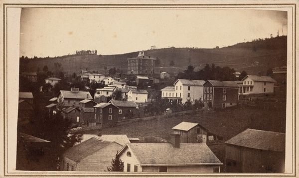 Curator: This gelatin-silver print, likely created between 1863 and 1865, captures a landscape view identified as "Honesdale, Section 1, Del. & Hudson Canal Co." attributed to Thomas H. Johnson. Editor: My first impression is one of a community nestled quietly within the land. There is a sense of serene harmony, the architecture echoing the soft slopes of the background. Curator: Focusing on its structure, one can see how the strong diagonal of the foreground earth directs the eye upwards into the meticulously arranged composition. The tonal range of the gelatin-silver process creates subtle gradations, mapping out depth across the photograph. The verticality of the trees in the background, combined with church steeples creates a strong vertical rhythm throughout the cityscape. Editor: Churches, particularly those with a prominent steeple, have historically signified spiritual aspiration and communal identity. Its placement centrally in the frame seems very deliberate. Perhaps the artist is reminding us of what the citizens placed at the very core of their existence? Curator: Perhaps, but let's not ignore the compositional effect of that steeple, echoing and counterpointing the other lines within the work! This is also an industrial image: examine the way the train tracks dissect the lower portion of the frame; an important compositional element indicating commercial exchange that’s now intersecting and reshaping this older, religiously oriented social order. Editor: I am fascinated how technologies become intertwined with the very identity of a town. Canals, railways, the church... These all create Honesdale's unique story, visualized and expressed in monochrome. This photograph acts as a visual record and an allegory to American aspiration during that era, I think. Curator: Yes. Ultimately, though, this image reveals a moment in time meticulously framed, exploiting the textural capabilities of the medium itself. We're seeing both the scene and the unique qualities of gelatin on silver. Editor: A convergence of the human story, rendered in gradients of light, as preserved within the artifacts of its time. A powerful thought to leave us with.