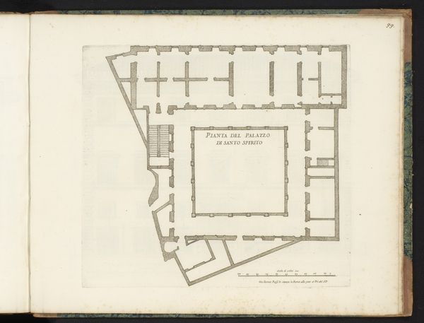 Curator: Ah, yes, "Plattegrond van Palazzo Spada," created after 1655 by Giovanni Battista Falda. This engraving and print, now residing in the Rijksmuseum, offers us a glimpse into the architectural layout of a Roman palace from the Baroque era. Editor: It's got a slightly faded look – almost like peering at a ghost of grand design. There's a stark simplicity to it, a blueprint that’s been pulled from some architect's dusty, leather-bound sketch book. Curator: Exactly. This piece really illuminates the Baroque fascination with geometric precision and order, yet simultaneously hints at the complexities of space and social hierarchy embedded within such structures. Notice the central courtyard – a vital social nexus - around which the more private rooms are arranged. Editor: It’s kind of austere, isn't it? Less of the Baroque flamboyance I associate with the era, and more like the skeletal structure beneath all the cherubs and gilded carvings. There are clear patterns - squares repeating as some sort of monumental echo. I can almost feel the endless walking the inhabitants might have to face on a daily basis. I get exhausted by just imagining all those rooms. Curator: The repetition of those squares speaks to something beyond just layout. Think of them as modules – symbolic units representing not just physical space but perhaps also social standing and the compartmentalization of life in the upper echelons. Editor: Compartmentalization... that's perfect! Like carefully labelled boxes for the privileged classes. So each space has a symbolic *and* practical purpose? And I imagine, that within those squares, there’s plenty of shadow and light playing against the surfaces that never appears in the schematic drawing. Curator: Undoubtedly. Falda provides the map, but our imaginations must fill in the rest. He wasn’t merely recording physical space; he was also participating in creating and reinforcing a cultural understanding of power through built form. Editor: So a cultural artifact masquerading as an architectural document? This makes me see that something functional like architecture is also an artistic interpretation. Maybe beauty is not only in the decoration but also the order underneath the ornament. Curator: Precisely! Perhaps looking at this image now, viewers can consider what "order" or beauty this particular period represents. Editor: Yeah. Definitely gives you a fresh way of thinking about where to put the furniture in your own apartment.