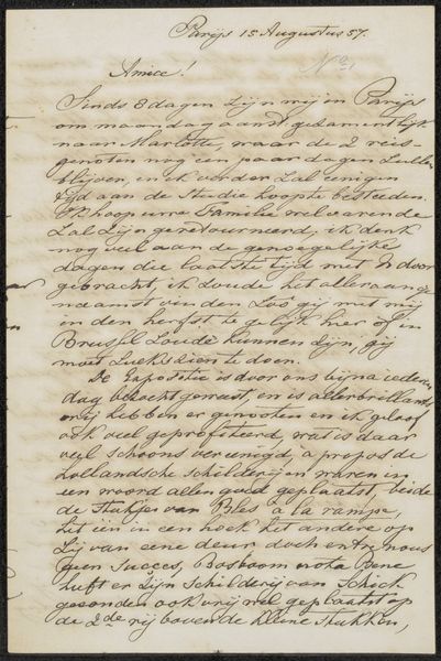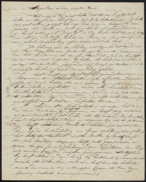 Curator: We’re looking at a letter by Joseph Hartogensis, possibly from 1850, currently held at the Rijksmuseum. The artwork, titled "Brief aan Jan Weissenbruch", is crafted with ink and pen on paper. Editor: My first impression is one of intimacy and perhaps a slight chaos. The close handwriting gives a feeling of immediacy. Curator: Indeed. The act of handwriting, particularly correspondence, served a crucial role in connecting individuals and solidifying community during a time characterized by widespread displacement, societal transformation, and restricted prospects. The content of this letter, its date, and the parties to whom it was addressed offer unique insights into the artist's journey and mindset amidst this environment. Editor: What's striking is how even a seemingly simple letter becomes an artifact carrying visual symbols. The ink, the specific handwriting—it evokes a sense of history and of personal identity anchored to that history. Curator: Absolutely. The deliberate action of hand delivery holds immense value. It acts as evidence of human experience, societal standards, and historical shifts. Furthermore, handwriting, as a physical manifestation of identity, offers insights into class dynamics, levels of education, and regional variances. Editor: The letter itself could almost be read as an abstract composition; a dense and rhythmic network of dark strokes against a lighter background. The smudges of ink hint at an urgency or a weariness of its creator, even! Curator: Right. The intersectionality of such analysis—attending to race, class, gender—allows us to investigate the circumstances of people creating, circulating, and consuming such images. Hartogensis would have existed within a social network that shaped both his artistic production and, inevitably, the meaning we derive from the remnants that are his material practice. Editor: It's amazing how an artifact seemingly as plain as a letter offers layers upon layers of interpretation, based both on content and on its physical manifestation. The images continue to speak to us, even when the exact language fades away. Curator: Precisely. In its simple form, it carries traces of an important exchange that may reflect both the individual challenges faced by Hartogensis as well as the communal struggle towards emancipation.