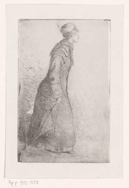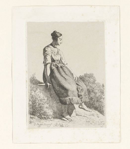 This print, titled "Jonge vrouw raadpleegt een margriet" or "Young woman consulting a daisy," was made by Jules Dieudonné using a technique called etching. In etching, a metal plate is coated with a waxy substance, and the artist draws through this layer, exposing the metal. Acid is then applied, biting into the exposed lines. The plate is inked, wiped clean, and then printed, leaving behind the image. Notice the delicate, linear quality of the marks. These are traces of a skilled hand and a corrosive chemistry, combined to create this image. It's fascinating how Dieudonné uses this industrial process to depict a scene of such quiet contemplation. The woman's simple act of divination with a daisy connects to larger themes of labor, value, and the meeting of nature and industry. By understanding the material and process behind the print, we can appreciate the full depth of its meaning. It encourages us to think beyond conventional divisions of craft and art.