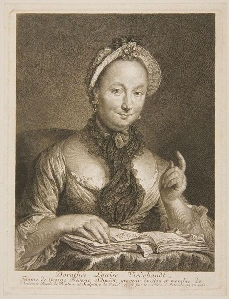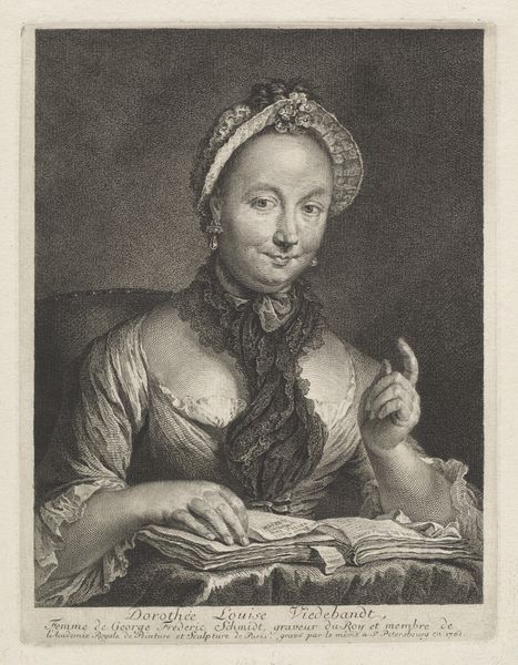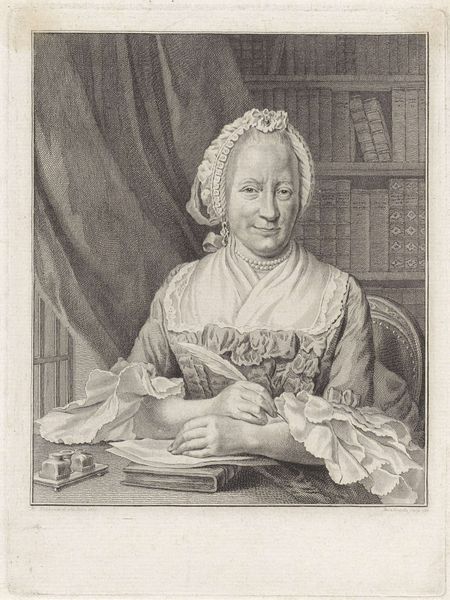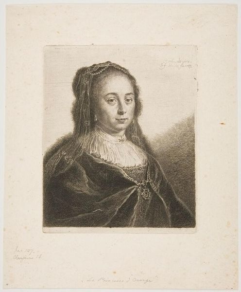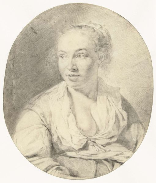 Editor: Here we have Cornelis Visscher's "Portrait of a Young Woman," a pencil drawing from sometime between 1650 and 1700, residing here at the Rijksmuseum. It strikes me as both intimate and formal. What stories do you think this portrait is trying to tell us? Curator: It is interesting you call it both intimate and formal; that tension is key. Note how Visscher uses light and shadow—*chiaroscuro*—to create not just a likeness, but an emotional presence. The sitter’s gaze, though direct, holds a hint of melancholy. What do you think her headdress and clothing tell us about her social standing, and perhaps her inner world? Editor: I'd guess she's of some standing, given the detail in her clothing. And there is something demure in the headdress. But, she almost seems a bit sad; as if trapped in this role, a feeling exacerbated by the muted palette. Curator: Exactly. The *Behuinekap*, or cap, wasn’t merely a fashion statement, but a marker of virtue, domesticity, piety. It constrained, but also protected. But there's more; that small bow at her collar—do you see how it hints at a suppressed playfulness? This isn’t just a portrait of a woman; it’s an encoding of societal expectations, rendered with surprising depth and psychological complexity. Editor: So it's not *just* what we see, but also what it *means* that gives the drawing such resonance? Curator: Precisely. Visscher uses seemingly simple lines to conjure layers of meaning. Portraits such as these remind us how even individual visages carry echoes of cultural memory and expectation. What did you learn from this encoding, in the cultural memory? Editor: How images encode meaning far beyond their subjects. Curator: Indeed. Let us now seek other stories hidden in the art.