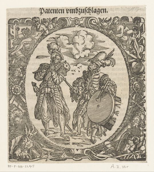 Editor: Here we have Jost Amman's "Vaandeldrager," created in 1573. It’s an engraving and woodcut on paper, currently residing in the Rijksmuseum. My immediate impression is how dynamic it feels, despite the limited tones. The lines create such movement. How do you see this piece? Curator: The engraving presents a complex interplay of textures and forms. Consider the central figure: notice how Amman utilizes hatching and cross-hatching to define the drapery, creating a palpable sense of volume and weight. Do you observe how the swirling patterns contrast with the relatively smooth faces? Editor: Yes, and I see the flag bearer is very ornate, while the other figures seem like shadowy silhouettes. Curator: Precisely. This strategic contrast directs the viewer's eye, emphasizing the figure as the focal point. Furthermore, observe the meticulously detailed ornamental border, densely packed with symbolic elements. It almost overpowers the central image. Editor: It's really crammed in there. But does that density of the border, contrasting with the relative openness in the center, have a function in the piece's structure? Curator: The function resides, primarily, in how this juxtaposition creates a dynamic tension, a visual rhythm that enlivens the overall composition. Note too how the white space around the border intensifies our focus, acting as a frame within a frame. What does that choice suggest to you? Editor: I think it highlights the craftsmanship but also, that framing emphasizes the image’s artificiality – it's constructed and self-aware, drawing attention to its visual components. It’s not trying to trick me into seeing “reality.” Curator: An astute observation. I’ve not seen this piece quite that way before, and that close visual assessment provides an interesting interpretation to the engraving as a whole.