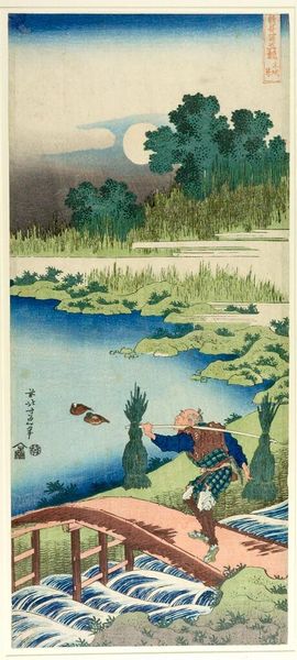 Editor: So, here we have "Cloth Fulling Jewel River in Settsu" a woodblock print from 1857 by Utagawa Hiroshige. It has this serene, almost dreamlike quality, especially with the moon and the women by the river. What do you see in this piece? Curator: I see a carefully constructed representation of gendered labour embedded within a specific cultural context. We are not just looking at a landscape; we're observing women performing the traditionally female task of cloth fulling, which was a crucial part of textile production in 19th-century Japan. This work subtly highlights their economic role within a society that often marginalized their contributions. Notice how the composition centres the women? How does that influence your interpretation? Editor: That's interesting! I hadn't thought about it in terms of labor. I was drawn to the moon and the stillness of the scene, like a romantic landscape. So, by focusing on these women, Hiroshige is making a statement about their place, their value? Curator: Exactly. Hiroshige’s art often touches upon the lives of everyday people. He subtly brings into question these ideas of women's economic agency. Do you see anything else within the visual representation that might be alluding to class, gender or other power dynamics? Editor: I see they're working outside and exposed while upper classes enjoy more comfort, so maybe this landscape aestheticizes some harsh realities. It's not just a pretty scene. Curator: Precisely! It's about recognizing those overlooked contributions. How does looking at the art knowing these histories, make you think about how you evaluate similar art moving forward? Editor: I definitely will not take it for granted! This makes me think of whose stories we are prioritizing, what's shown and what's deliberately unseen. It makes the piece richer, and gives the viewer much more to contemplate.