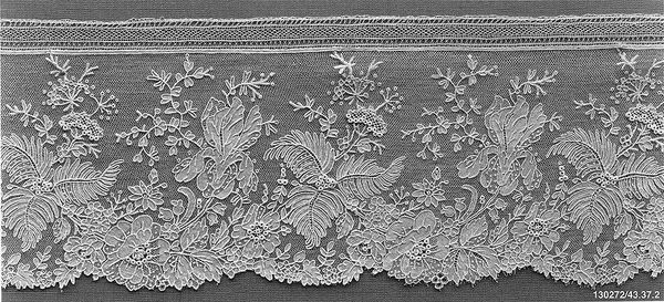 This delicate lace flounce was created by Georges Martin of the Compagnie des Indes, sometime in the 19th century. Intricate floral patterns and sinuous ribbons create a field of symbolic representation. Consider the image of the ribbon, a motif stretching back to antiquity. Originally a simple band used to bind and connect, it evolved into a symbol of status, adorning religious figures and the nobility in paintings throughout the ages. Here, its presence interwoven with blooming flowers speaks to themes of nature and elegance. One can trace a similar evolution of the floral motif in art, from early symbolic uses in religious iconography to representations of earthly paradise. These recurring motifs, passed down through history, trigger something primal in the viewer, stirring collective memories of celebration and renewal. They are powerful forces, engaging viewers on a deep, subconscious level. The ribbon and flower dance, an eternal recurrence—reshaping, resurfacing, and gathering new meanings.