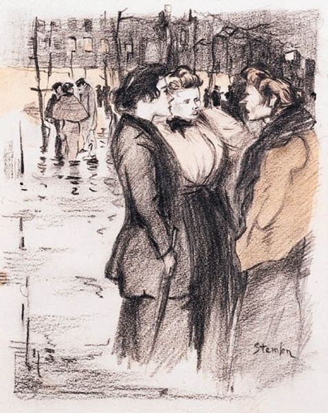 Théophile Alexandre Steinlen, a Swiss-born French artist, created this drawing, titled "He Acts Like a Painter", capturing a scene likely from the late 19th or early 20th century. It depicts three well-dressed gentlemen observing a man with a camera, his equipment suggesting the laborious early days of photography. This image speaks volumes about the shifting social perceptions of art and labor in France during this era. The gazes of the men suggest a mixture of curiosity and skepticism towards the photographer, who might have been seen as an outsider to the established art world. Steinlen, known for his socialist leanings, often portrayed working-class life. This work subtly critiques the established artistic circles, inviting us to consider who gets to define art and what labor is valued. To understand this piece fully, one might delve into the history of photography and its acceptance within the artistic establishment, as well as the social and economic contexts that defined class distinctions in France at the time.