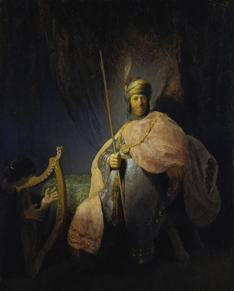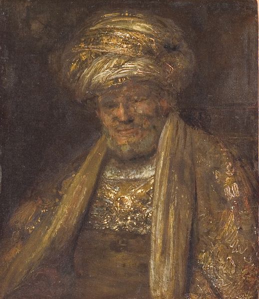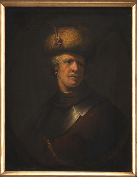 Curator: Let’s turn our attention to Rembrandt van Rijn's "Man in Oriental Costume," sometimes known as "The Noble Slav" or "Man in a Turban," dating back to 1632. It's oil on canvas, currently residing here at the Met. What strikes you most about it? Editor: He looks...wistful. Like he’s seen a few empires rise and fall, all while trying to find a good rug. It's that face, isn't it? The deep set eyes... Curator: Indeed. Notice how Rembrandt utilizes materials to evoke the sitter's status. It's oil paint, but look closely – consider the layering, the impasto in that turban. And what kind of labor went into sourcing those pigments? Ultramarine alone... Editor: Right. It does feel a bit like dress-up though, doesn’t it? I can almost hear him thinking, "Does this turban make me look important?" I've always thought that there was playfulness. Like he's caught between worlds, maybe poking fun at the exotic. Curator: Precisely. This sort of "orientalism," as it's sometimes categorized, had real market demand. Think about the networks needed to get these 'exotic' garments, likely theatrical costumes, into Rembrandt’s studio, alluding to trade routes. Also consider, were these actually the clothing worn by any particular figure in Rembrandt’s community, and the implied social structure of laborers responsible for assembling the raw material? Editor: But look at that light though, the way it hits that robe… Rembrandt really knew how to make fabrics sing. Its also that subtle play on status—dignified yes, but accessible, relatable. Perhaps an allegory for humanity more so than a period history painting… It feels deeply, profoundly human. Curator: Exactly. And think about the economic structure that sustains Rembrandt. Patrons commissioning portraits, each brushstroke part of a commercial enterprise—a constant cycle of creating commodities from very earthly materials and production practices. Editor: Right, but it doesn’t *feel* commodified when I’m looking at him! That's Rembrandt's magic, isn’t it? Transforming materials into something that whispers directly to our soul. Curator: Yes, from pigment to perceived 'genius,' quite a material transformation. Thank you for speaking to that alchemic property with me. Editor: Thanks, that made me look at things with new eyes, it all boils down to finding some spark that moves your heart.