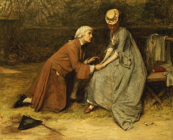 William Powell Frith's painting, "The Lovers," invites us into a serene moment of courtship, capturing a narrative that was deeply embedded in Victorian society. Frith, a celebrated chronicler of modern life in 19th-century England, often used his art to explore social themes. Here, the artist presents a couple in a rural setting, perhaps a commentary on the romantic ideals of the time, reflecting the increasing urbanization that pushed people to seek solace in nature. The young woman, carefully plucking petals from a flower, seems to be engaged in the age-old game of 'he loves me, he loves me not'. The image suggests the rituals and uncertainties of love, framed within the rigid social conventions of Victorian courtship. Frith was associated with The Clique, a group of artists who sought to keep narrative painting relevant in the face of avant-garde movements. By studying Frith’s paintings alongside popular novels and social commentaries of his era, we gain a clearer understanding of the values and anxieties that shaped Victorian society.
