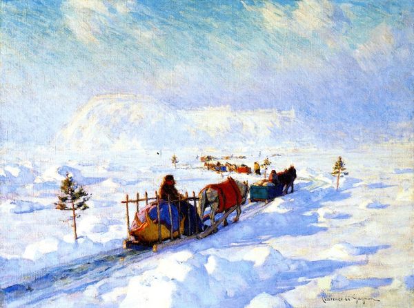 Curator: The painting we're observing is Nikolay Bogdanov-Belsky’s "To School," dating from 1941. It captures a winter scene with children riding a horse-drawn sled. Editor: Immediately, the coldness strikes me. It's not just the snow, but the muted blues and whites that dominate. The artist does play on the texture of the winter environment and reflects the cold environment. Curator: Absolutely, Bogdanov-Belsky often focused on peasant life and education. This painting provides insights into the rural experience of children in Soviet Russia attending school, even in harsh conditions. Editor: Note how the light catches the snow, creating long shadows which, formally speaking, gives a kinetic direction that leads your eye away and to the background trees and structures. It directs the reader through space. The painting balances warmth – those rosy cheeked faces – and frigidity in an almost contradictory yet totally pleasing composition. Curator: He was very much part of the Social Realist movement, reflecting everyday life and promoting accessible art for the masses. "To School" tells a story of resilience and dedication to learning, even against a backdrop of economic hardship and, of course, the shadow of the war at this point in time. Educational reforms would be pivotal to Soviet progress. Editor: I wonder about that sled! Look at the construction—a roughly built wooden affair—and compare this to the relatively gentle brushwork on the children’s faces or in the distant treeline, the materiality, it presents itself, a contrast between roughness and refinement that is hard to reconcile on a first read of this work. It speaks to the ingenuity borne of scarcity. Curator: Precisely! And while some critics might consider the subject matter propagandistic, it undeniably humanizes the subjects. We get a small window into the daily journeys of this very determined group of young students. Editor: Indeed, while rooted in a specific historical context, "To School" achieves a timeless quality, which helps to elevate and distill winter's crisp embrace with a message of optimism amid challenging circumstance. Curator: I find it fascinating to see how artistic choices interact with cultural messaging. "To School," at a distance, highlights not only education, but also resilience.