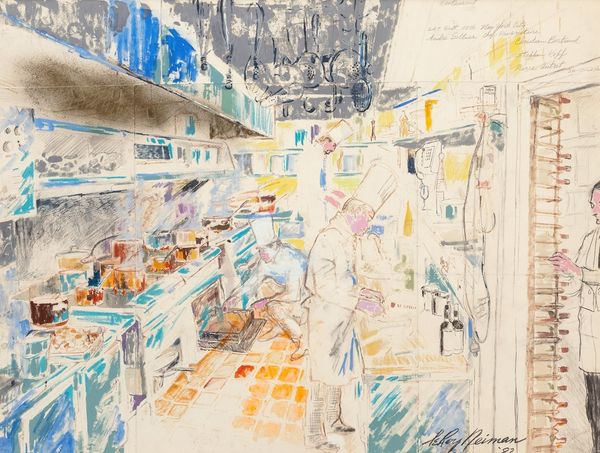 Jean Dubuffet made this watercolour painting, Café au damier, with ink and watercolour on paper. It’s hard to know when, but the wonky buildings and weirdly proportioned vehicles are made with sketchy lines and diluted colour washes, that give this piece a naively charming quality. The surface of the paper is visible in areas, giving the piece an unfinished, provisional feel. In contrast to the transparent washes, in some areas, like the red sign on the side of the bus, the paint is more opaque, acting as an anchor for the composition. I really like the way Dubuffet uses line to suggest form and movement, almost like a comic book or cartoon. Look at the large bus on the left: the wheels, the window, the passengers inside are all rendered with such simplicity. Dubuffet was interested in the art of children and the mentally ill, and he sought to emulate their raw, uninhibited style in his own work. You can see the influence of these sources in the simplified forms, awkward perspective, and scribbled lines of this painting. It reminds me of Picasso, who also took inspiration from the art of children. Ultimately, though, Dubuffet’s vision is unique, funny, and deeply human.