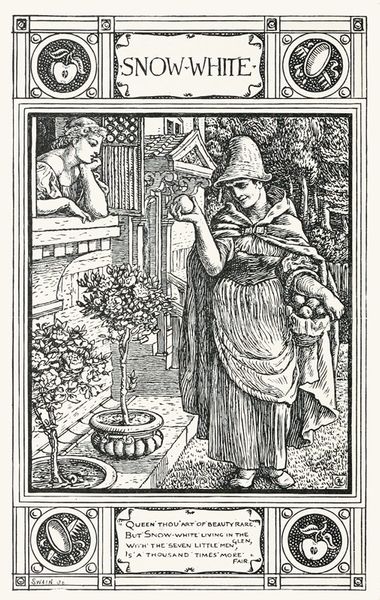 Curator: Walter Crane created this pen and ink drawing, "Mother Hulda," in 1922. Editor: It has such a pensive atmosphere. The monochromatic palette enhances this, doesn’t it? The intricate linework forms this dense but ultimately very still composition. Curator: Crane’s facility with line is undeniable. Notice the almost calligraphic quality of each stroke, how he uses varied densities to suggest light and shadow across the folds of the woman's dress, and even the texture of the well's stone. Editor: The subject’s class origins are foregrounded, too. Her garb and placement next to a well reference labour, especially women's labour, framing a story about toil and its relationship with virtue. Curator: Yes, exactly. And the stylized border adds another layer. The shapes almost mirror the narrative playing out in the picture—geometric forms containing softer, organic motifs. This interplay mirrors the constraints versus freedom implicit within fairy tales. Editor: That bottom banner offers insight: “Then the girl went back alone to the well...in despair she jumped down into the well, the same way the spindle had gone.” Mother Hulda appears to draw on broader questions of how society treats women when domestic work, often their only perceived offering, has been transgressed, lost, or “failed.” Curator: Precisely, Crane is known for integrating socialist ideals into his fairy tale illustrations. He elevates form with symbolic references. The composition and structure are as significant as the narrative elements. Editor: And, perhaps more than a quaint, traditional story, the fairytale is reinterpreted into social critique that asks more of those in positions of power, encouraging consideration and even resistance against systems of inequality. The choice to centre the subject’s emotion, with all that detailed ink work in the foliage around her, allows us to experience an affect of transformation along with her. Curator: A fitting end, that.