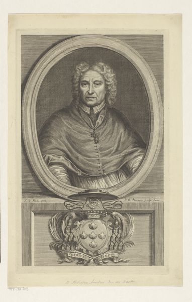 Editor: This is "Portret van kardinaal Carlo Pio," a portrait made between 1657 and 1659 by Giacomo Piccini. It’s an engraving, a print, and I find the detail in the Cardinal's robes striking for this medium. How do you interpret this work within its historical context? Curator: Well, considering its period, the print serves a critical function of disseminating imagery and reinforcing power structures. Here, the baroque style and the act of printing itself are inherently intertwined with the Catholic Counter-Reformation and the Cardinal's own standing. How do you see the printed image contributing to Cardinal Pio's authority? Editor: I hadn’t thought of the printing itself as contributing, but the wider availability certainly spreads his image. Would this be aimed at other religious leaders? Curator: Perhaps not exclusively. Prints circulated amongst a wider, literate audience, and such a portrait might serve to solidify Pio’s position in broader society, demonstrating the Church’s influence, which was particularly important in a time of great religious and political upheaval. The history painting tag reinforces the gravity afforded the subject and the work. Notice the text within the oval around his figure? What do you think it means for how this work might be received? Editor: It reads "Pius of Savoy, Cardinal". That’s a fairly explicit statement of who he is and his power. Is the artist elevating Pio, or simply documenting him? Curator: It’s hard to separate the two. An artist doesn't exist in a vacuum, and in that era, the line between representation and idealization, documentation and aggrandizement, was very thin indeed. Consider how a contemporary audience might interpret this imagery. Editor: It gives me a lot to think about regarding power, representation and image distribution.