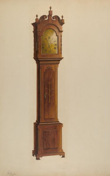 Curator: Immediately, a sense of quiet domesticity washes over me looking at this image. There's something comforting about its static presence. Editor: Indeed. We are looking at Francis Law Durand's "Grandfather's Clock," a colored-pencil drawing created around 1937. Note the meticulous rendering; Durand's academic style seeks precision in every line. Curator: Precision, yes, but the subdued palette evokes nostalgia. The wood grain effect, carefully created, makes me consider temporality and how materials age alongside lived experiences. It feels like more than just the rendering of an object; it's an evocation. Editor: Certainly, that feeling emerges from Durand's commitment to social realism during the era. One can discern, by virtue of the chosen object, the role the artist envisioned for their art. Clocks, symbols of domesticity and industriousness, reflected common ideals of order and a shared awareness of time. Curator: From a formal perspective, consider the artist's mastery of shape. The composition achieves stability and even grandeur in an everyday object. The careful attention to shadow adds volume, enhancing its architectural nature. Notice, too, how each distinct section contrasts tonally. Editor: And within this constructed reality, observe how the object might have represented the idealized family values frequently shown in art and visual media during the Great Depression. Objects such as these represented continuity, and reliability amid instability. Curator: Fascinating how Durand used this object to invoke more than timekeeping, then. The craftsmanship is so skillfully rendered that it transcends mere replication, presenting us a slice of collective experience from the past. Editor: Precisely. Durand reminds us that everyday items carry cultural significance. “Grandfather’s Clock” marks an enduring legacy about aspiration and remembrance.