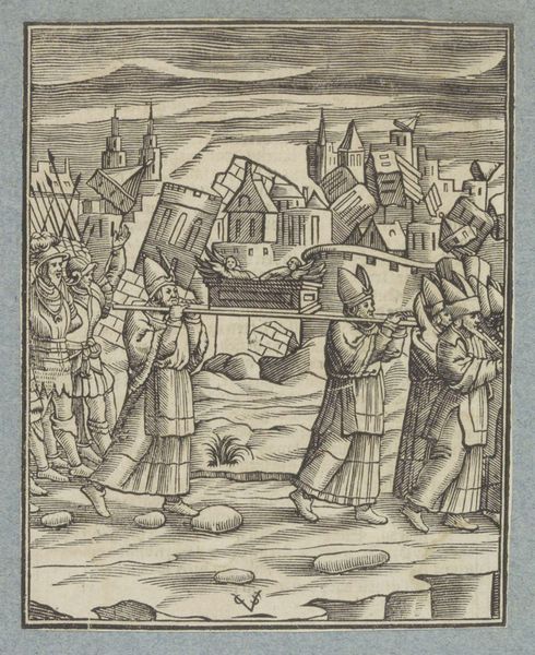 This woodcut, "Overleg tussen drie krijgslieden," was created by Christoffel van Sichem II. Its intricate details and the absence of color immediately draw us into a world defined by form and texture. The composition is structured around three figures, likely soldiers, posed in what appears to be a strategic meeting. Sichem's use of line is particularly striking; parallel lines create depth and shadow, giving volume to the figures and architectural elements. The swirling lines of the sky contrast with the angular geometry of the buildings and the column. The column, partially destroyed, is a key structural and symbolic element. It stands as a classical reference, perhaps alluding to the ruins of past empires and the transient nature of power. The soldiers are framed by the decaying column, their conversation, hinted at by their gestures and facial expressions, becomes part of a larger narrative about conflict, strategy, and the legacies of history. Ultimately, Sichem’s craft lies in his ability to transform a simple scene into a complex reflection on power, decay, and the human condition.