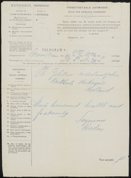 This is a telegram made in 1928 by the Dutch postal service, or PTT, in the Dutch East Indies. It gives us a glimpse into the social life of the Dutch in what is now Indonesia. The telegram, sent from Surabaya, likely to a hotel in Weltevreden, present-day Jakarta, conveys congratulations to the addressee, wishing their family a joyful celebration. It seems the sender, maybe part of the family Vandersande, wants to be part of the festivity in spirit. What’s interesting is the use of this technology, the telegram, to convey a familial sentiment. It speaks to the importance placed on maintaining connections across distances in a colonial context. By looking into archival sources, like the PTT’s records or hotel guest registries, the historian might be able to reconstruct the lives and relationships embedded in this seemingly simple message. The telegram shows us how social relationships were maintained through institutions and technology.