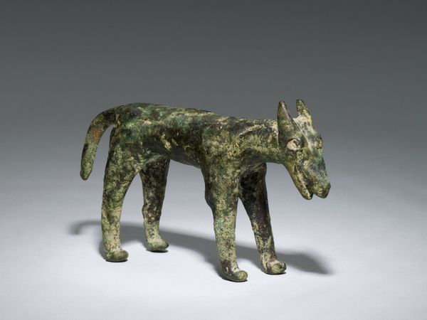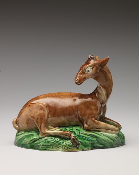 This earthenware figure of a fox with a dead cockerel was made by Ralph Wood the Younger in Staffordshire, England, sometime in the late 18th century. It's a great example of the kind of decorative objects that were being produced at the time, using molds and colored glazes that mimicked more expensive porcelain. The reddish-brown glaze on the fox is particularly effective, giving the figure a sense of warmth and life, while the green glaze on the base suggests a natural setting. The labor involved in creating this piece would have been significant, with different workers specializing in each step of the process, from mixing the clay to applying the glazes. It reflects the growing consumer culture of the time, where people were eager to decorate their homes with affordable, stylish objects. Ultimately, this figure invites us to consider the complex relationship between art, industry, and social life in the 18th century, and to appreciate the skill and artistry that went into even the most mass-produced objects.