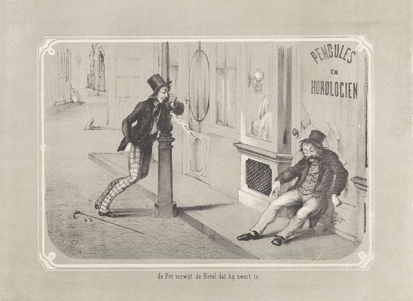 Editor: This print, "Presence of Mind," created around 1888 by W. Duke, Sons & Co., uses colored pencil. The scene depicts a tailor attempting to measure a fleeing customer! There’s a quirky energy to the scene, like a frozen moment from a comedic play. What can you tell me about the symbols in this image? Curator: Indeed! Consider how this image plays with established tropes. The tailor, an age-old symbol of precision and control, is here rendered almost predatory. His outstretched arm and the scissors form a potent symbol of economic anxiety for the client. Do you notice any echoes of "craftiness" attributed to particular ethnic groups here? Editor: Yes, I see how the caricature leans into established stereotypes. The exaggerated features and desperate stance...it’s a loaded image. I almost missed it, actually. I was too focused on the cartoonish expressions. Curator: Precisely. These expressions function as symbols too, instantly recognizable. Think about the broader cultural context: burgeoning capitalism, anxieties around debt, and entrenched biases. Notice how it is connected to "Puck" magazine. It makes the caricature part of the emotional language of that era. Editor: So the humor itself is a kind of symbol, masking deeper societal tensions? Curator: Absolutely. It allows a potentially uncomfortable truth – economic disparities and social prejudices – to be delivered with a dose of (bitter) sugar. It is, however, worth thinking about how this imagery might become dangerous as well. Editor: It’s incredible how much historical and social information can be packed into such a small, seemingly lighthearted image. I learned that images can reinforce beliefs in covert ways, by means of something funny or seemingly normal. Curator: Yes! Symbols offer encoded glimpses into cultural memory. By understanding them, we unveil more layers than might immediately apparent!