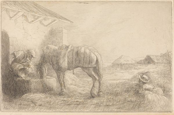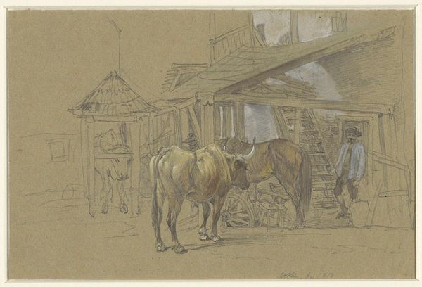 Editor: This is "Schapen en een geit voor een stal," or "Sheep and a goat in front of a barn," created between 1822 and 1891 by Simon van den Berg. It's currently held at the Rijksmuseum. It seems to be a preliminary sketch in pen, perhaps for a larger work. It’s interesting to see the artist’s initial approach. What elements of visual composition do you observe here? Curator: The sketch emphasizes line and form. Note the repetitive vertical strokes creating a sense of enclosure; a stark contrast between the interior space and the blurred background. The arrangement of animals offers a play of shapes, masses, and varying densities. The animals in the foreground are relatively defined compared to the background’s looser, almost gestural, marks. How does the use of line guide our eye? Editor: I see how the heavier lines define the central sheep, drawing focus. The lighter lines seem to suggest movement and texture, particularly in the background. It creates depth without much shading. Curator: Precisely. Observe how the hatching technique—parallel lines used to create shading—defines form. The concentration of lines creates areas of perceived shadow, giving the figures volume despite the sketch’s apparent incompleteness. What of the relation between figures in the artwork? Editor: They almost seem posed. A few look straight ahead. It is observational, as though capturing a specific moment in time, but I can not clearly discern the intent. Curator: Van den Berg’s technical choices bring our focus toward how he depicts shape using the texture of the varying and inconsistent pen strokes. The essence of the barn's inhabitants and the barn interior, which could be symbolic, as it’s an incomplete structure. It asks how an artist captures the rudimentary structure of space. Editor: It's fascinating how a simple sketch can reveal so much about an artist’s technique and perception, rather than solely historical elements. I will have to be on the lookout for line weight moving forward. Thanks for helping to clarify the value of the formal reading.