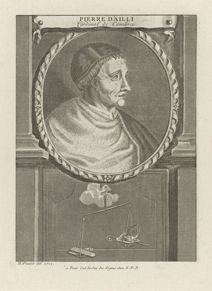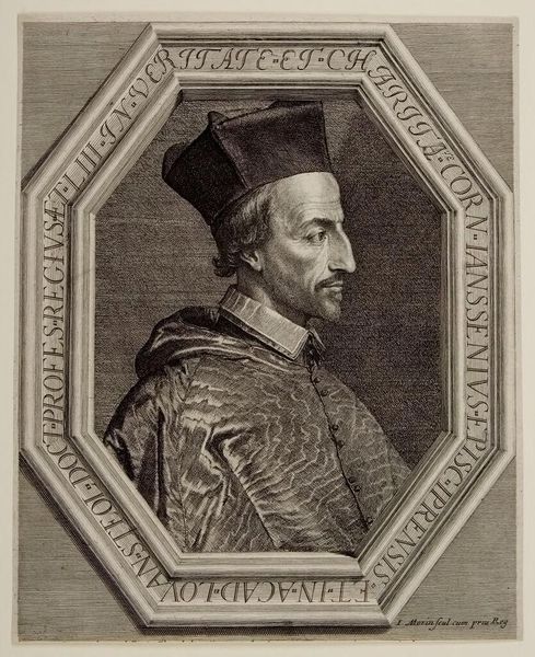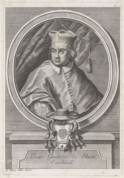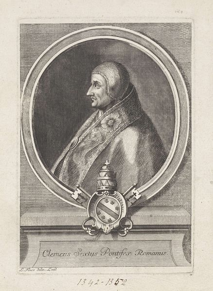 Curator: Here we have an engraving, likely dating from the 17th century, titled "Portret van paus Urbanus IV"—"Portrait of Pope Urban IV" in English. Editor: My first impression is how meticulous the linework is. You can really sense the hand of the engraver. It's almost like looking at a meticulously rendered drawing in metal. Curator: Absolutely. Engravings like this were often reproduced, serving both as historical records and vehicles for disseminating particular images and ideologies. Notice how the oval frame containing Urban IV almost feels like a coin or a cameo, solidifying his status. Editor: And it's fascinating to consider the materials themselves—the metal plate, the ink, the paper. These weren't readily available to everyone. Who was consuming these images? What function did this engraving fulfill in its original context, beyond simply documentation? Was it part of a book? Was it framed and displayed? Curator: It’s very probable it was part of a larger publication. Notice the symbolic weight the image carries: the Papal Tiara, the crossed keys of St. Peter—emblems of Papal authority. His garments, heavily embroidered, project the magnificence of the church. Even his severe profile seems calculated to inspire deference. The lily on the family crest! It shows a definite political program of self-representation at play. Editor: Exactly! And engraving was a laborious process; its reproducibility allowed for wide dissemination, making it a powerful tool to shape public perception, solidify power, and maybe even drive the narrative during a very specific and contested historical moment. This seemingly simple image then speaks volumes of a time and place when authority and representation were intensely intertwined with the very means of production and reproduction of these materials. Curator: That gives a new perspective, doesn't it? To see this engraving as not just a portrait, but also as a testament to the Church's desire to maintain a firm grip on its spiritual, political, and economic power. Editor: Precisely! Next time I see an engraving like this, I’ll definitely wonder who held the burin, what their status was, and how the image functioned in relation to the materials employed and the social networks that were built around this complex reproductive technology.