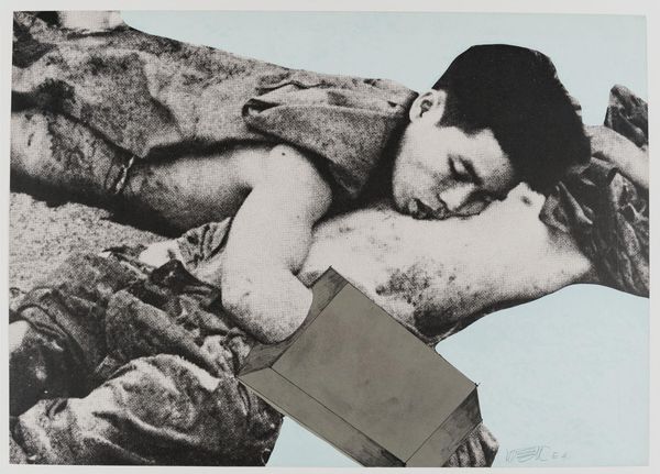 Curator: I'm struck by the somber mood. The man’s face is obscured, resting on what appears to be a television set. It feels heavy with disillusionment. Editor: That's Wolf Vostell's "Olympiade 2," a print that uses collage to layer imagery and meaning. His work often critiqued media and consumerism within the context of post-war Germany. Curator: The floating boots above—are they a reference to conflict, perhaps? And the odd placement of the television set—is it meant to symbolize a false idol? Editor: Likely. Vostell was deeply concerned with how media desensitized individuals to violence and political issues. The imagery, jarring and disjointed, reflects that fractured reality. Curator: It’s interesting how the artist uses commonplace images to create a commentary on broader societal issues. Thank you. Editor: Indeed, Vostell transforms mundane symbols into potent cultural critiques.