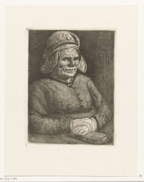 This is an etching by Gerard Jan Bos, depicting a woman wearing a linen bonnet. Bos, who lived from 1860 to 1943, renders this woman with an incredible level of detail, capturing the wrinkles of her face, which seem to tell a silent, yet complex story. During the late 19th and early 20th centuries, there was an increased interest in portraying the working class. The woman's modest attire and posture reflect the realities of working-class life. The linen bonnet suggests a practical, unadorned existence, hinting at the social and economic conditions of women during this period. The book could symbolize literacy, or the Bible, offering a glimpse into her inner life and perhaps her faith, providing solace in a challenging world. Bos offers us a representation that strays from idealized beauty, inviting us to contemplate the lives of ordinary people. Bos captures an emotional honesty, encouraging a dialogue about identity, class, and the everyday experiences of women in his time.