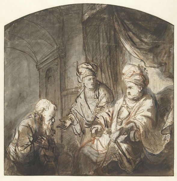 Curator: The Tate presents this small-scale work by Sir David Wilkie, "Woman Seated by a Bed, with Other Figures." Note its dimensions: a mere 156 x 118 millimeters. Editor: It's immediately striking. Dark, brooding... the figures seem almost consumed by the enveloping blackness. Curator: Observe how Wilkie uses chiaroscuro. The light isn't merely illuminating; it sculpts and defines forms, creating visual drama. The composition directs our gaze. Editor: The bed itself seems to be a symbolic stage—a site of illness, perhaps even death. The woman's red gown seems to pulse with a life force that contrasts with the pallor of the bedridden figure. Red frequently represents passion and sacrifice. Curator: It's a study in contrasts, indeed. The texture, achieved through loose brushstrokes, builds an image that seems both complete and unfinished. Editor: It makes you wonder about the narrative, doesn't it? What stories lie within those dimly lit spaces? Curator: Wilkie's command of form and light provides ample room for speculation, wouldn't you say? Editor: Precisely! This work lingers in the mind, a puzzle of symbols, masterfully wrought.
