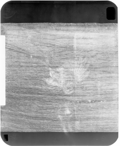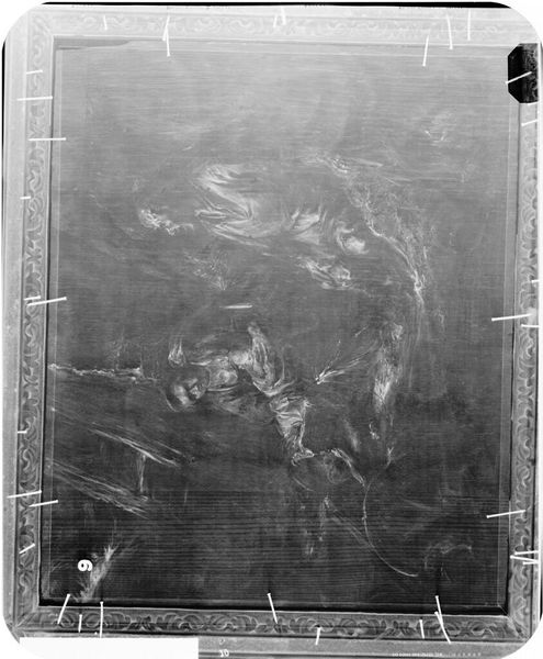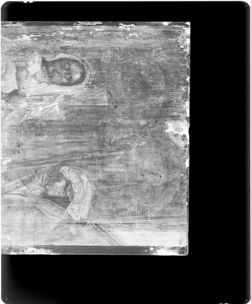 Curator: This is an X-radiograph of "Marriage of the Virgin," attributed to Michelino da Besozzo. The film measures 14 x 17 inches and it's held in the Harvard Art Museums. It's haunting, almost ghostly. Editor: It's intriguing how this X-ray reveals layers of creation and perhaps alterations within the context of a marriage scene. What does this reveal about gender roles and expectations of women in this time? Curator: Exactly. We can analyze the pigment composition, brushwork, and the support structure. The materiality provides clues about the artist's workshop and the socio-economic status of the patron commissioning it. Editor: It speaks to the intersections of power and piety, reflecting a visual language used to reinforce social hierarchies. By viewing it through this lens, we confront uncomfortable questions. Curator: Yes. It also reveals the often-invisible labor that underpins artistic creation. Editor: Indeed, understanding the cultural narratives will help us to discuss power, gender, and identity. Curator: Precisely. The analysis of materiality combined with social and historical context gives this art piece new meaning. Editor: I agree. I will go back to this later to reflect more about its importance.