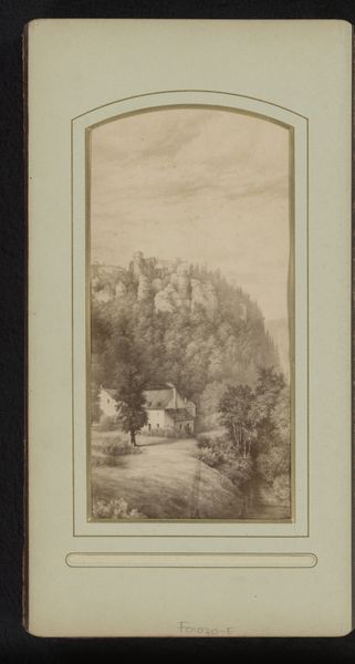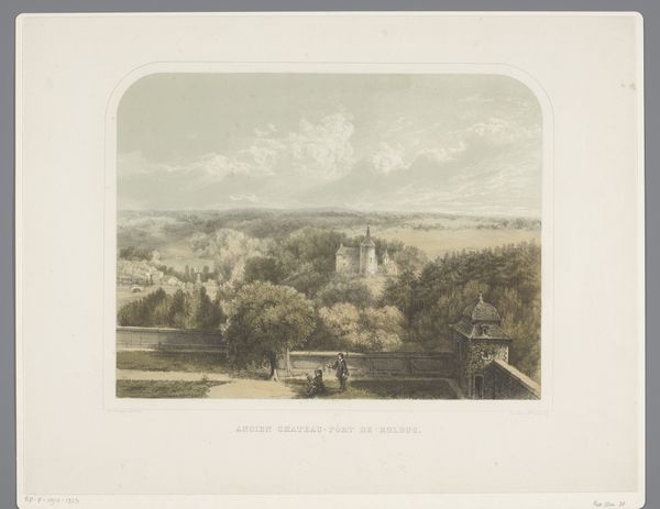 Alexander Schaepkens created this artwork, Kasteel Schaesberg, using pen lithography. The work presents a muted palette, dominated by subtle gradations of greys and browns that evoke a tranquil, almost melancholic atmosphere. Schaepkens masterfully balances the composition, drawing the viewer's eye towards the architectural structure nestled amid verdant trees. The foreground provides a sense of depth, framing the castle. Schaepkens captures the castle as more than a physical structure; it becomes a signifier of history and power, embedded within the semiotic landscape of 19th-century romanticism. The artist doesn't merely represent a castle, but offers a meditation on time, memory, and the interplay between nature and human construction. Note the calculated arrangement of light and shadow that not only defines the castle’s form but also reinforces its symbolic weight. In this way, the artwork becomes a study of the visual rhetoric of landscape, inviting us to consider how the depiction of space and form shapes our understanding.
