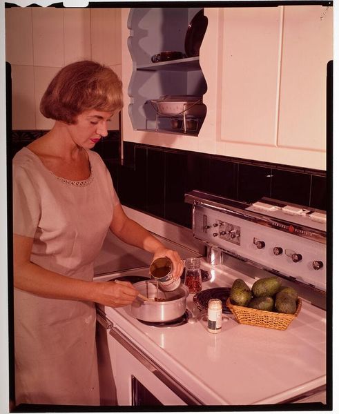 Curator: This photograph by Jack Gould, simply titled "Untitled (female chef grinding corn into meal)" shows a woman engaged in a domestic task. The image has a lovely, warm tonality to it. Editor: Yes, it feels very familiar. The corn grinder, the bowls...it evokes a sense of tradition and a direct connection to food preparation, almost ritualistic. Curator: Absolutely. The act of grinding corn holds significant cultural weight across many societies. It represents sustenance, community, and the preservation of heritage through culinary practice. The apron, too, is symbolic. Editor: It's interesting how Gould captured this scene. The dated kitchen design and the woman's determined expression speak to both the timelessness and the socio-economic context of this activity. It raises questions about labor, gender roles, and the unseen work that sustains families. Curator: I agree. The symbolism is quite rich here. Seeing this image allows us to reflect on what we value and what has been lost from our collective memory. Editor: Indeed. It's a powerful reminder that the mundane can be deeply meaningful.