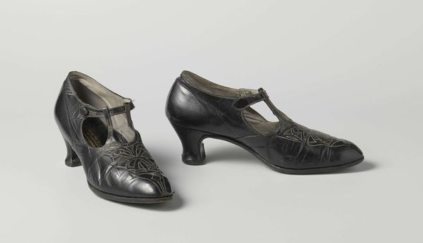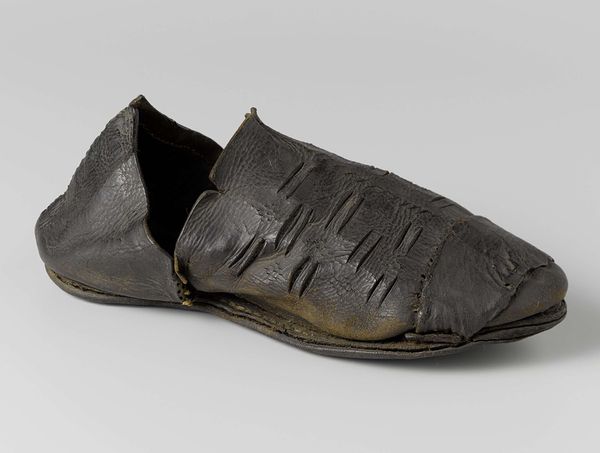 Curator: Here we have "Galoshes," a photograph likely taken between 1884 and 1888. Editor: My first thought is 'sturdy.' The form is solid, utilitarian. They are quite pragmatic-looking things. Curator: Indeed. The object, galoshes themselves, speaks volumes about the era. Function dictating form, clearly. The tight composition and sharp lighting focus our attention entirely on the texture and shape of these overshoes. There is a certain visual honesty at play here, isn’t there? Editor: Absolutely, I am also pondering what these say about their owner, or society at large. The black rubber, even the way the light reflects off it, evokes a time of industrial growth, perhaps even social anxieties around hygiene and class. Think of all the Victorian-era mud and muck these things have trod through. They tell tales, silent yet compelling. Curator: An astute observation. One might view the object itself as an aesthetic embodiment of social progress and practical application. The lines of the galoshes themselves contribute to their appeal, even elevating them into a designed object of study. Editor: It makes you think, doesn't it, about the power of everyday objects to accrue symbolic meaning. Here they’re isolated from wearers in a clean setting that removes context but asks us to think of who used these, where, and what meaning they have within our history. It invites a discussion on how the past walks alongside us in tangible forms. Curator: Precisely. The photograph strips bare all extraneous details and, as such, invites this deconstruction of functional form. An evocative visual investigation overall. Editor: A photograph speaking to enduring practicality, even beauty, inherent in functional design and what these objects might recall for modern audiences.