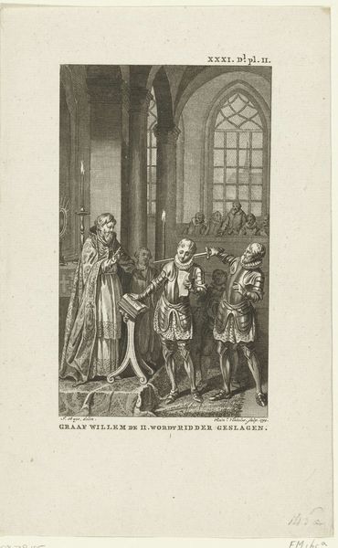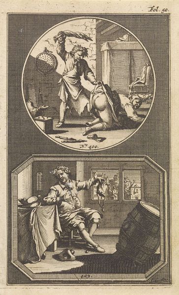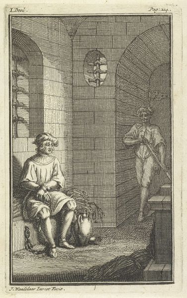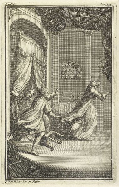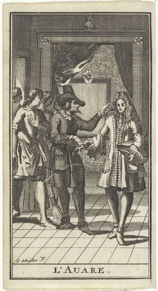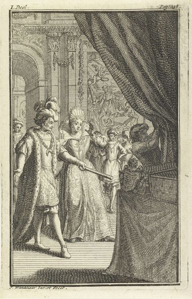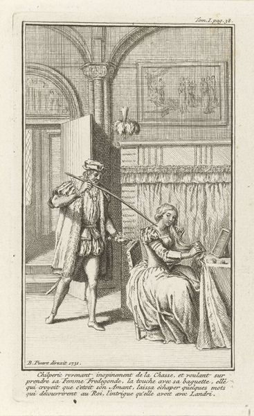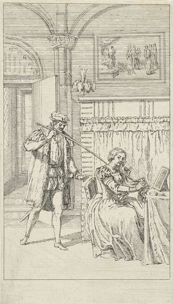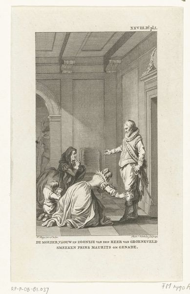 Editor: Here we have Jan Wandelaar’s engraving, "Vrouw knielt voor een voorname heer," from 1722-1723. The scene feels very theatrical and staged, with the woman kneeling before the nobleman. What strikes me most is the stark power dynamic visualized here. How do you interpret this work? Curator: This piece immediately brings to mind the rigid social structures of the 18th century, doesn't it? It is tempting to see a critique of patriarchy and class privilege embedded within the seemingly simple narrative. Note the architecture. It dwarfs both figures but the man controls the scene. Where do you think the female figure’s vulnerability is rooted? Editor: Well, she’s literally on her knees! That posture, combined with the nobleman’s stance and gesture, really emphasizes her subjugation. Curator: Precisely. And think about the historical context: this was an era defined by strict social hierarchies and limited opportunities for women. How does the artist visually reinforce those constraints? The surrounding interior acts as a symbolic cage for this drama of subservience, as if performed under surveillance. Does the coldness in tonality offer any clues? Editor: I see your point. The whole scene, rendered in this stark engraved line, lacks warmth and emphasizes the formality of the interaction and power imbalance. It seems very calculated and cold. Curator: It is as though Wandelaar is laying bare the mechanics of oppression. Now, considering this work in relation to feminist theory, how might we interpret the woman’s agency, or lack thereof? Does the image challenge or reinforce societal expectations of women during the Baroque period? Editor: I initially saw just a simple depiction of deference. But framing it through social hierarchy reveals a visual argument about the restricted roles imposed on women, so even the act of kneeling becomes a statement. Curator: Exactly! By analyzing art through lenses like gender and social class, we gain deeper insights into the past. It invites a contemporary discourse that reveals these power structures in visual form. Editor: Thanks, I see it now! Thinking about these power dynamics really opens up the print.