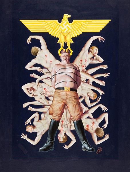 Curator: I’m immediately struck by the painting's somber atmosphere, this pall of smoke and fire juxtaposed against those strangely aggressive heraldic figures... It’s unsettling. Editor: We're looking at Heorhiy Narbut's 1916 watercolour, "Allegory of the Destruction of the Cathedral at Reims". The piece clearly leverages symbolism and allegory to make a statement about war. Curator: That's putting it mildly. Look at that rooster, bristling, versus the Prussian eagle—they’re locked in this grim duel above the burning cathedral. War has rarely been so brutally... literal. It’s fascinating but disturbing. I feel as though he manages to paint sounds. Do you notice all the things that have fallen to ground in the wake of the fighting? There is almost a still-life aspect with a discarded guitar, prayer book, flag, and royal attire in the composition's lower right foreground. Editor: Precisely, Narbut is making specific compositional choices. The symmetry is unsettling—the two birds mirrored in their aggression, the architectural ruins mirroring each other, half intact and half engulfed by the cloud of destruction. Consider the formal interplay: the bright sky vs the darkness below. Curator: So much anger... and, honestly, grief, saturates the painting! Those colours! They evoke pain rather than aesthetic pleasure. Also, this isn't about a physical building at all, is it? The desecration of culture, the trampling of ideals… That's what’s really burning. What an artistic response to war... a truly lasting wound. Editor: Yes. The burning cathedral acts as more than mere architecture but rather as a metonymic vehicle which facilitates a wider expression about the futility of war. Furthermore, notice the subtle semiotic construction regarding Narbut's colour choices. He implements bright sky colours in direct opposition to the ground with it's darkened, earthly colours. His careful consideration adds further insight into the dichotomy between physical life, the world of ideas and beliefs, and that of nature. Curator: Exactly! Narbut transforms what could've been propaganda into something deeply affecting and multifaceted through his distinctive use of colour. Editor: A stark reminder of the profound human cost, visually arresting for its use of allegory, colour, and formal layout. Curator: I think I'll never forget this—it stays with you, doesn't it? It serves as a beautiful reflection on something awful, like capturing a sunset with tears.