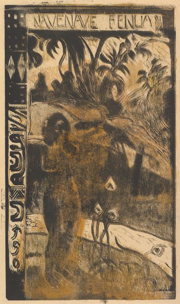 Paul Gauguin created "Nave nave fenua" as part of his Noa Noa Suite using woodcut and monotype. The print presents a striking contrast between the dark, heavily worked areas and the lighter, untouched spaces, evoking a sense of mystery. The composition is structured by a vertical division, with a decorative, glyph-like border contrasting against the central scene. Gauguin's manipulation of the woodcut medium is evident in the rough, textured surfaces and the bold lines that define the figures and flora. This interplay of textures creates a dynamic visual field, engaging the viewer in a tactile experience. Gauguin's interest in Primitivism is evident in the flattening of perspective and simplification of forms, moving beyond mere representation. This approach reflects a broader artistic and philosophical concern with destabilizing established modes of seeing and representing the world. The tension between the graphic elements and the evocative imagery highlights Gauguin's exploration of art as a vehicle for expressing complex emotions and ideas. The print challenges us to reconsider the boundaries between representation and abstraction.