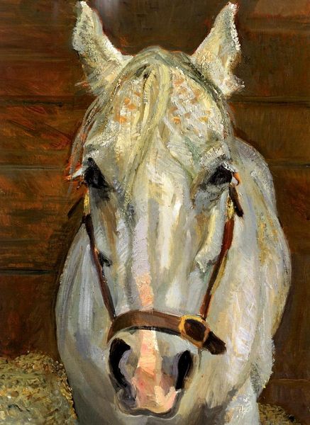 Curator: Here we have Henri de Toulouse-Lautrec's 1881 painting, "White Horse 'Gazelle.'" It's a stunning piece painted in oil on, it appears, fresco. Editor: It’s strikingly melancholic. The horse’s gaze is heavy, and the darkness surrounding it amplifies that sense of… captivity, maybe? You can almost smell the stable, the horse, the straw in this image; it's heavy and sensual, which speaks to the oil paint. Curator: Indeed, Lautrec, though young at the time, had a keen eye for capturing emotion. The "Gazelle" was created in the time when country life with the horses and fields dominated painting exhibitions. Note the horse's subdued elegance - the aristocratic symbol and one with deeply patriarchal roots here looks calm in his stall. The scene contrasts starkly with Lautrec's later, more scandalous subjects found within Montmartre. Editor: Right, and consider the physicality of fresco painting alongside oil, especially combined, for depicting an animal so intrinsically tied to labor and aristocratic pursuits. Fresco is, fundamentally, about surface, texture, a social context tied to building. Oil, then, adds this remarkable luminosity to something quite mundane and reveals how art elevates even ordinary life into beautiful visual records of time and being. Curator: Precisely. There's a tension between the raw physicality, as you noted, and this sense of refinement and class distinction that existed through animals. You see, the history of equestrian painting is inseparable from the rise of aristocratic power in the art world and world at large. How does the painter and painting perpetuate power here? Editor: Hmmm… By subtly challenging the medium and composition? We know his later works upended social norms. Perhaps it is a proto-rebellion, focusing more on the individual animal – Gazelle – rather than celebrating broader social and political hierarchies linked to equine imagery. I find something radically democratic, materially, in the artmaking. Curator: An interesting suggestion. "Gazelle" is a snapshot of a society in flux, captured by an artist on the cusp of finding his own, revolutionary, visual voice. The painting challenges the conservative art traditions through which it was created. Editor: For me, thinking about Lautrec working this painting – oil on top of fresco and the time needed for drying reveals his mastery. It also humanizes not just Gazelle, but all work in the arts. Curator: Very well said. Thank you.