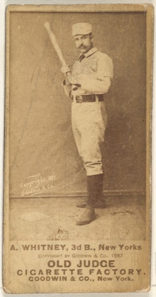 Curator: Here we have an 1888-89 baseball card produced by Goodwin & Company, part of the "Old Judge" series for Old Judge Cigarettes, now residing at the Metropolitan Museum of Art. The subject is Jimmy "Loafer" McAleer, center fielder for Cleveland. Editor: My first thought is that it has a very nostalgic quality, with that sepia tone invoking a sense of early Americana. His pose almost feels rehearsed or stoic for the period. Curator: That sepia is directly tied to the photographic processes available at the time—a silver gelatin printing process on albumen paper, then reproduced as these affordable cards, inserted into cigarette packs. Think of the massive industrial apparatus required to mass-produce these things, connecting consumer habits, image making, and the celebrity culture that was then emerging with the rise of professional sports. Editor: Right, and baseball itself as a symbolic marker of burgeoning national identity—McAleer with his bat aloft representing those ideals of prowess and virtue associated with the sport, amplified here for commercial gain, like a talisman promising prosperity and health, aligning him, however subtly, with the virility and success promised by the product. Curator: I find it compelling that the photograph isn’t just a neutral recording. Goodwin & Co. added their name to this card as if to lay claim on McAleer’s cultural impact, inserting themselves into the production not just of the cigarettes, but also of athletic stardom. The materiality itself – card stock, ink – and their accessibility point towards democratization. Before this, portraiture would only have been available to the upper class. Editor: Exactly! McAleer himself almost embodies a bridge. Baseball still had a sense of folk appeal back then. You’re seeing this move towards commercial appeal in athletics as baseball's popularity increases. I do wonder what his nickname “Loafer” references. Perhaps, on another level, that connects with this idealized representation of that era, an almost “leisure” of the sport or some perception thereof? It is worth examining the duality embedded in this image – his individual representation contrasted with mass production, as much then as it remains now. Curator: Absolutely. The intertwining of athletic hero-worship and industrial output marks a very specific moment. Seeing such material at the Met shows its historical significance from its manufacturing to cultural iconography.