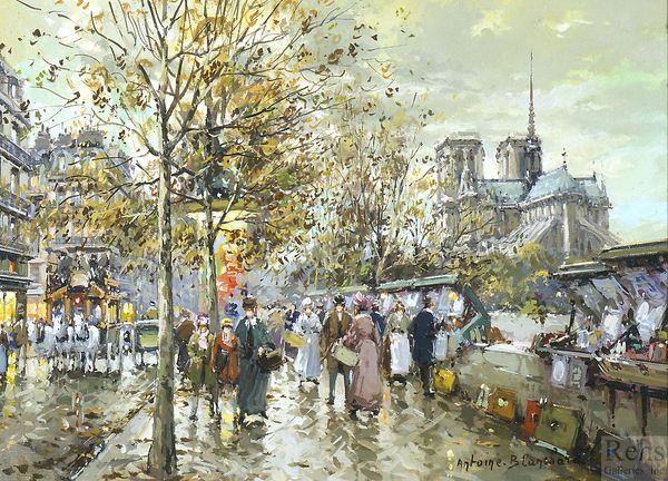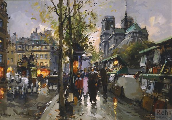 Editor: Here we have Edouard Cortes' "Bouquinistes", an oil painting capturing a Parisian street scene, probably created en plein air. The palette feels muted, autumnal... making me feel a bit melancholy, yet drawn in. What strikes you most when you look at it? Curator: Melancholy, yes, I feel that too. It’s funny, isn't it, how a painting can almost... hum a particular mood. For me, it's the light. See how it reflects off the wet pavement? Cortes masterfully uses that reflected light to illuminate the scene, making the everyday feel almost magical. It reminds me of a slightly blurry memory. What do you think of the way Cortes depicts the people? Editor: They seem less detailed, almost like smudges of color that gives a sense of movement... very Impressionistic! Like they're part of the atmosphere more than distinct individuals. Curator: Exactly! It’s less about specific portraits and more about capturing the general vibe, the *feeling* of being there on that particular day. Like a snapshot of a moment, of fleeting Parisian life near the Seine and Notre Dame, where booksellers display their wares. Do you get a sense of a specific era looking at this work? Editor: I do. Maybe the late 19th or early 20th century, before everything became so digitized? It’s nostalgic, romantic almost. Curator: Precisely. Cortes was the master of light of Parisian streets. Makes me want to curl up with a worn book and a steaming mug of something warm, listening to the rain. Editor: I agree. I learned so much from Cortes' street scenes. I can't believe how it seems like he invented light with his impressionistic point of view.
