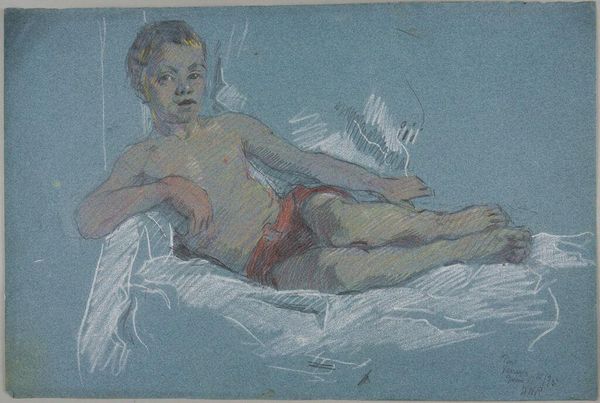 Curator: What strikes me immediately is the pervasiveness of blue. A blanket, an aura, perhaps melancholy... Editor: That's it exactly! Blue dominates, rendering the scene almost monochromatic and definitely melancholic. We're looking at "Child in Bed," a pastel from 1884 by Berthe Morisot. The work captures a very intimate moment, that vulnerability of illness. Curator: The swaddling effect certainly amplifies that feeling, a gentle vulnerability depicted with soft strokes and the child's gaze, which doesn't quite meet ours. This deliberate lack of direct eye contact removes agency and increases fragility. In iconographic terms, children can stand for innocence and new beginnings; however, set against this backdrop of illness... the message changes. Editor: Indeed. It subtly challenges societal expectations surrounding motherhood during the late 19th century. We are invited into a domestic sphere, which often constrained women of Morisot's time, but also a space charged with anxiety, with perhaps societal implications around health, poverty, motherhood itself as a construction. There’s an undeniable sense of both care and helplessness captured here. Curator: Considering those domestic dynamics, it also subtly suggests the psychological impact of the confined, domestic space. The colors could then represent an internalization of such societal constraints. We often frame her within Impressionism, which allows for subjective feelings to permeate. Editor: That framing also seems critical given how much those "constraints" differed for male and female artists during this period. With pastels, the immediacy and intimacy create a powerful resonance. The lack of preparatory sketches reveals that sense of being on the precipice of...something happening... of something vulnerable exposed. Curator: I think both the materials used and color palette serve to echo that feeling. These features combine into this potent image of concern but also hope for renewal—a powerful glimpse into private life, captured in this fleeting, poignant moment. Editor: Ultimately, "Child in Bed" confronts us not only with an exquisite aesthetic experience but demands interrogation: to face assumptions regarding female domesticity, societal well-being, and to address what still affects us. The image persists as testament both vulnerable and fierce!