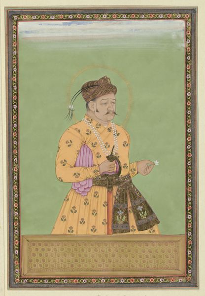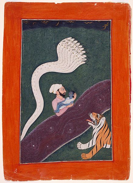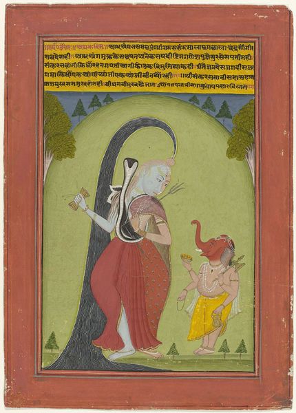 In this hypnotic image, the Hindu god Shiva and his wife Parvati share one body, in the form known as Ardhanarisvara, ‘lord whose half is woman.’ It reveals Shiva as a symbol of his omnipotence, the seed and womb of all creation and destruction. Here, a razor-sharp vertical divides and unites the image, with the artist depicting the respective halves with individualized dimensionality. Shiva assumes the role of bearded ascetic, wearing a garland of skulls, with his attributes, the trident, kettle-drum, and bull vehicle, Nandi, at his side. His right hand tames a snake while another serpent wraps Shiva’s topknot, which in turn, catches the river goddess Ganga on her decent from heaven to the earth. Parvati, herself a manifestation of Devi (The Great Goddess), and embodiment of Shakti (female energy), is princess and daughter of the Himalaya—the source of the Ganges River and abode of the loving holy family. The mauve mountain and exuberant, lotus-filled pool are typical of the Bundi school in Rajasthan, and respectively represent Lake Manasarovar and Mt. Kailash in Tibet.