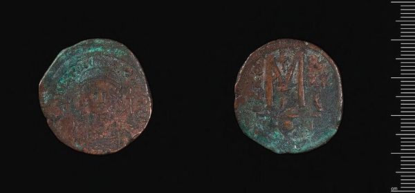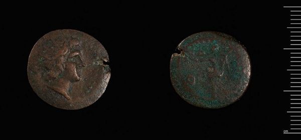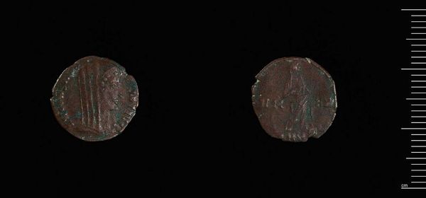 Curator: The green patina of this bronze coin speaks volumes about its age and elemental composition. It’s identified as a coin of Constantine I, minted in Constantinople. Editor: It’s remarkably small and worn, almost humble. You wouldn't guess it was tied to such a powerful figure. Curator: These coins functioned as propaganda. The portrait on the obverse projected imperial authority, circulated widely, entering everyday lives and economies. Editor: And what about the cross-like symbol on the other side? It is more than just an object of trade and taxation, isn't it? Curator: Precisely, it signals Constantine's complex relationship with Christianity. These coins helped shape perceptions of his reign. Editor: It’s fascinating to consider how a simple piece of metal could carry such weight. Curator: Indeed. Its creation, circulation, and survival all offer unique perspectives on the socio-political landscape of the era.