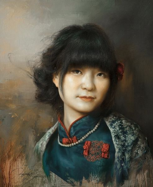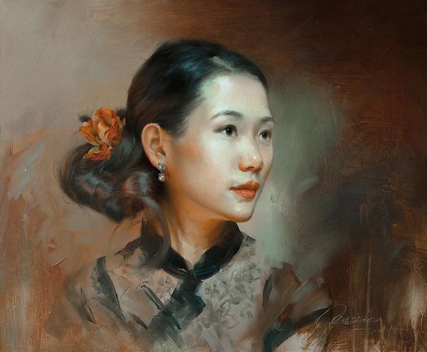Kun Wang’s portrait, “Time Passing By”, employs oil paint to create a compelling image. The artist has layered the paint to give a palpable sense of depth, from the soft, almost porcelain-like skin of the sitter to the intricate detail of the lace she wears. Oil paint has a fascinating history; for centuries, it was prized for its ability to capture light and texture with unparalleled realism. Here, Wang builds on that tradition but also brings something new. The textures are not just realistic, they also express a mood, a sense of quiet contemplation. The way the light catches on the woman’s face, the subtle gradations of tone, all speak to the artist’s deep engagement with the material. Consider how much labor went into producing not only the painting, but the lace itself, likely produced by industrial means. Wang invites us to consider the relationship between hand and machine, tradition and modernity, in a single, resonant image.