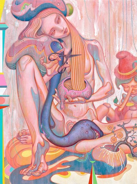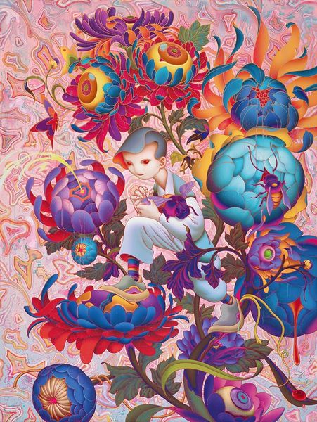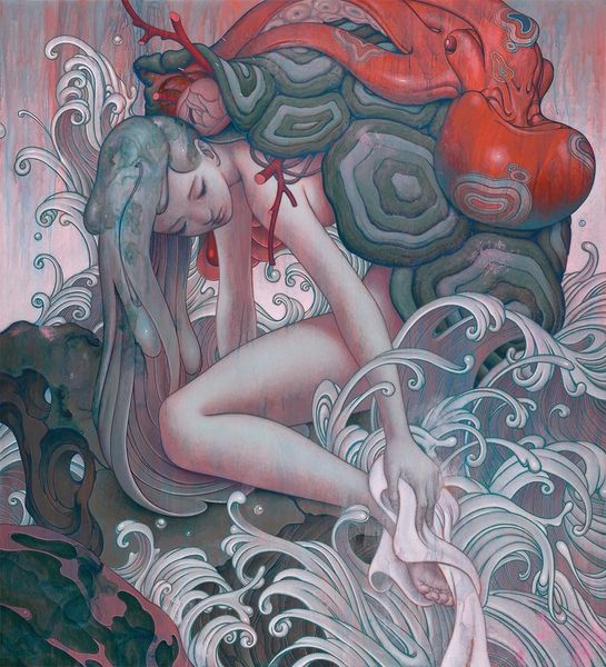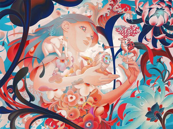 Editor: So, here we have James Jean's "Eden" from 2020, a mixed-media piece that feels both incredibly delicate and intensely symbolic. I'm immediately struck by the almost overwhelming detail – and the air of… sorrow, maybe? What do you see in this piece? Curator: Sorrow is a fantastic entry point. I see a modern re-imagining of the fall, heavy with the weight of choice and consequence. But not in a fire-and-brimstone way, right? More like a melancholic acceptance. Notice how the traditional roles are blurred: is the female figure protecting her face in shame or perhaps shielding herself from a blinding truth? And the Adam figure…almost burdened, as if weighed down not by guilt, but by understanding. Tell me, do those floral elements add or detract from that feeling of sorrow in your mind? Editor: That’s interesting – I hadn’t thought about the shielding aspect, but now I do wonder if it’s a protection. As for the flowers, at first, they seemed to lighten the mood, like naive art, but now, paired with your point about "burdened" Adam and this overall dreamlike unreality, they also suggest innocence lost? It all has a strange otherworldly vibe. Curator: Exactly! There's a push-and-pull here, a constant negotiation between light and dark, innocence and experience. James Jean is known for blending the beautiful with the unsettling, a signature blend of pop-surrealism and raw emotion. Don’t you agree? It seems he isn’t making a statement, as much as presenting a reflection – and posing some rather profound questions about ourselves. What are your takeaways? Editor: Well, I walked in seeing one thing – regret. Now, I'm also seeing the potential for acceptance and that push-pull struggle that’s so very human. So complex. Thank you. Curator: My pleasure. Isn't it fascinating how art can shift our perceptions, isn’t it? Always remember that a work’s truth lies just as much in the eyes and heart of the beholder, as within the art itself.