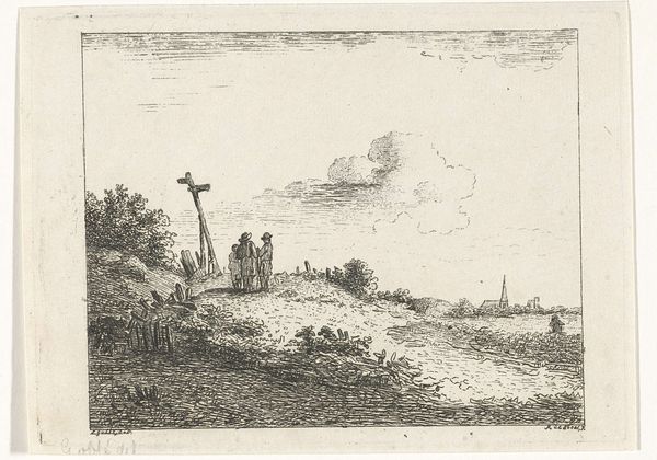 Curator: This etching, attributed to Joost van Geel and titled "Storm op zee," immediately communicates a sense of precariousness. The diagonal tilt of the ship, the churning waves rendered through incredibly fine lines... it feels quite ominous. Editor: Indeed. The stark black and white lends itself well to the drama, but the composition feels intentionally theatrical. One almost wonders if Van Geel ever witnessed a scene quite this dramatic, or if he aimed at illustrating the terror that sea travel holds for many. Curator: It is fascinating how prints were utilized in 17th-century Dutch culture. Beyond purely aesthetic considerations, prints were affordable disseminators of information and social commentary. We see a coastal community seemingly unfazed by the shipwreck taking place so near, as well as figures in authority viewing the devastation from a distance atop horseback near what is identified in script below as a toll station of some sort. Editor: Looking closely at those onlookers, the artist renders a keen eye towards spatial dynamics and contrasts. See how the solid, earthy figures on the coast oppose those at sea that rock from the waves and are imperiled with drowning? Curator: You raise a very relevant point. I think "Storm op zee," created after 1666, taps into the anxieties of a nation deeply reliant on maritime trade and conquest. The maritime power of the Netherlands came with an understanding of vulnerability. The toll station and collection of authority figures overlooking this scene certainly has a strong parallel to this vulnerability of its holdings by water. Editor: The formal choices magnify these anxieties so effectively. Look at how the etching technique allows for a textural depth, capturing both the fury of the sea and the solidity of the land, almost as separate realms in conflict. Curator: That textural richness allows for an allegorical reading, I agree. We observe nature itself presented as this destructive force that can suddenly unsettle social and economic structures. It forces one to think about ideas circulating at that time about Dutch trade networks and the costs associated with such success, given the natural risks of the open water. Editor: An insightful reflection! Ultimately, for me, Van Geel’s work, through its visual power, asks questions about the precariousness of human existence set against the sublime, indifferent backdrop of nature. Curator: And it serves as a chilling reminder that for all the Netherlands achieved by controlling the sea, it was forever subject to the sea’s power.