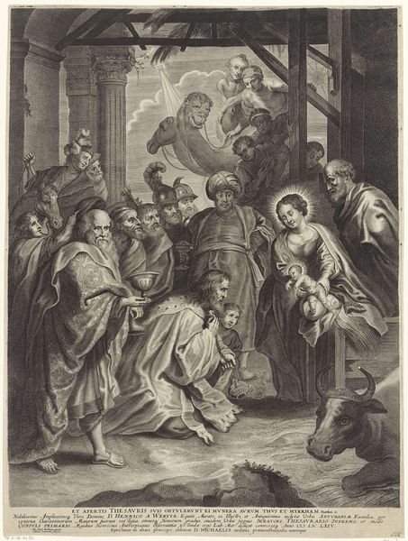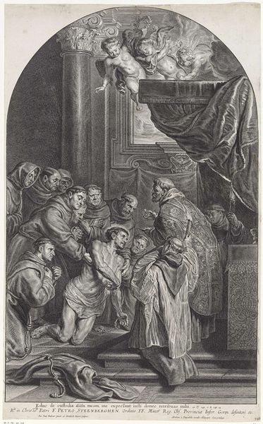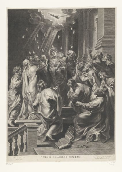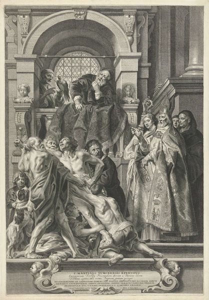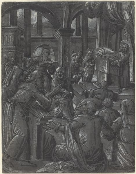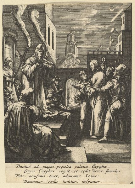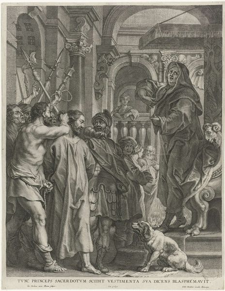 Curator: We're standing before "Christ Before Caiaphas Tearing His Clothes," an engraving attributed to Marinus Robyn van der Goes. It's dated sometime between 1630 and 1654 and resides here at the Rijksmuseum. What strikes you first? Editor: The stark contrast. It’s a chaotic composition, but the monochromatic rendering imbues it with a chilling and dramatic effect. The density of lines creates deep shadows and amplifies the sense of emotional turmoil. Curator: Indeed. Van der Goes employs a variety of techniques—hatching, cross-hatching, stippling—all serving to modulate light and shadow across the composition. This manipulation gives depth to the architectural setting, notice the carved ornament, and defines the figures, particularly the central group around Christ. Editor: Looking at the figures and the texture, the production of prints requires physical skill in mark-making. The choice of materials significantly impacts the emotional weight of the scene; it is a blend of religious zealotry with class structures implicit in its means of production and circulation. Curator: I understand the context you are bringing. The formal structure itself underscores the central drama. The perspective guides the eye directly to Caiaphas, the High Priest, as he tears his robes—a gesture signifying outrage at Christ's supposed blasphemy. It is framed through architectural cues, drawing parallels to classic period styles to enhance narrative potency. Editor: But consider what this suggests about labor. To create these textures—smooth skin, rough cloth—demands skill, time, and practice. Prints like this are reproduced. This labour connects the sacrilegious spectacle and the artist. Curator: The engraving presents us with complex thematic layers—justice, sacrifice, faith. What is your reading of it? Editor: The power dynamic, as it illustrates social inequity while reinforcing these power structures in an age where faith often determined who held privilege. I can't ignore the role of the process to how this piece means. Curator: It's a remarkable example of Baroque history-painting. A narrative captured through light, shadow, and line, skillfully manipulated to evoke a potent emotional and theological response. Editor: Thank you; I now recognize my own process and relationship with what faith represents within art-historical frames. It does open up dialogue surrounding materials to ask important questions concerning our perceptions.