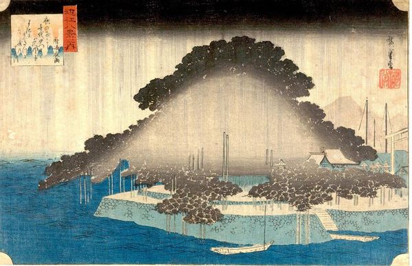 Editor: Here we have Utagawa Hiroshige’s "Asakusa Temple." It's undated, but the woodblock print feels like a captured moment, a fleeting impression. The overwhelming rain gives it such a somber, reflective mood. What do you see in this piece? Curator: Ah, Hiroshige. He understood atmosphere. The driving rain, almost a curtain, doesn't obscure the temple; it *reveals* it, somehow. Makes you want to huddle under an umbrella, doesn’t it? Editor: Definitely! The rain makes the temple feel distant, almost dreamlike. Curator: Indeed! The artist captured a moment but also created a lasting impression. This piece speaks to impermanence and the beauty in fleeting moments. Editor: Absolutely, I'll think of that from now on.