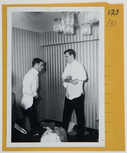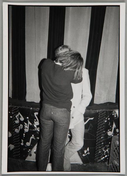 Curator: Let's turn our attention to Bill Dane's "Untitled (San Francisco)," a black and white photograph currently held in the Harvard Art Museums. Editor: Ooh, I feel like I’m crashing a punk show from the late 70s. There's something wonderfully chaotic about it. Curator: Dane was known for his candid street photography, often capturing the pulse of counter-cultural movements. Note how the jumpsuit, emblazoned with slogans, becomes a kind of walking manifesto. Editor: Exactly! The words "Substitute Authority" scrawled down the leg, that's pure rebellion. It’s like visual music, gritty and raw. I wonder what kind of noise they were making. Curator: Perhaps Dane sought to document the emergence of new forms of social commentary and identity through clothing and performance. He was interested in the way art could intervene in everyday life. Editor: It's a great reminder that art isn't always in fancy frames. Sometimes, it screams from a dive bar stage, stitched onto the back of a jumpsuit. Curator: Indeed. Dane’s image provides a glimpse into a moment of cultural foment. Editor: It’s a blast of energy, capturing the spirit of a time when words, music, and clothing were weapons of choice.