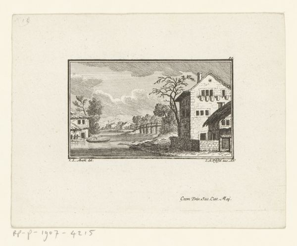Johann Andreas Pfeffel's "Gezicht op een landhuis" presents a landscape dominated by linear precision and an acute attention to form. Notice how the composition is structured around a central building, its geometry stark against the natural forms of the landscape. Pfeffel employs line not just to depict, but to define the very essence of each element, from the meticulous brickwork to the subtle gradations of the sky. The textures, rendered through the density and direction of these lines, contribute to the piece’s visual weight. Consider the semiotic interplay here; the house acts as a signifier of stability, while the surrounding wilderness hints at the unpredictable forces of nature. The bridge in the foreground acts as both physical and symbolic connection, yet its classical design also imposes a rigid order onto the scene. Ultimately, Pfeffel invites us to consider how the structural clarity of artistic form can serve to frame our understanding of nature and culture.