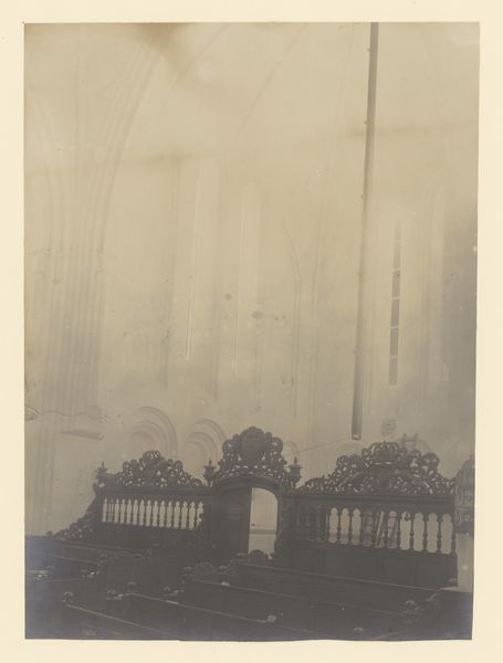 Curator: Well, this gelatin-silver print, known as "Houten huis in een bos" or "Wooden House in a Forest," is attributed to Laurens Lodewijk Kleijn and likely dates between 1865 and 1900. Editor: Spooky. It feels like stumbling upon a forgotten memory, doesn't it? Everything is muted, almost veiled. It gives off this mysterious, almost fairytale vibe. Curator: I agree, there’s a deliberate romanticism at play here. The layering of branches, obscuring the subject. The house, though the supposed subject of the photo, becomes more symbolic, alluding to shelter or hidden life. It evokes a sense of longing, of something just beyond our grasp. Editor: Totally! Like a gingerbread house, but abandoned after the witch left. The house itself looks… almost like a ghost in the forest. Curator: It's the high contrast, perhaps? Early photographic processes like this one often struggled to capture details we expect today. That visual effect, along with the dark tonality, actually amplifies the feeling, turning a mundane scene into something profound. The forest, itself, takes on an almost cathedral-like presence, doesn't it? The way the vertical lines of the trees ascend skyward. Editor: Yes! It feels a bit gothic and sublime too, I think. Like nature will take over what’s temporary...a fragile house succumbing to a forest is heavy with that symbolism, right? Curator: Definitely. It makes you consider human temporality when facing such persistent natural growth. A powerful juxtaposition, which certainly pulls at Romantic and Symbolist heartstrings. It certainly speaks to the fragility of human structures against the imposing forces of nature, mirroring anxieties prevalent during that era. Editor: True. There’s something wonderfully unsettling about finding it depicted through a photo rather than a painting or print. Makes you wonder about that fleeting, frozen moment in time that this depicts. So different from Instagram snapshots now. It just feels so heavy, you know? Curator: Exactly. This image represents more than just a wooden house; it's a poignant meditation on time, nature, and our place within them. It has a depth that speaks across centuries, using symbolism and aesthetics to reveal psychological undercurrents. Editor: Definitely stuck with me. What looks simple ends up holding layers and layers, like that very forest.
