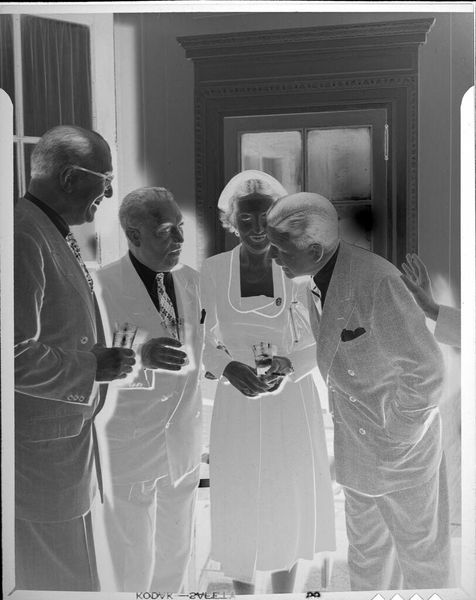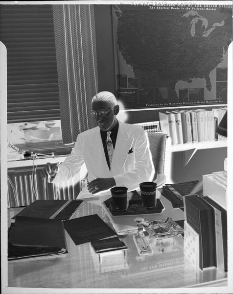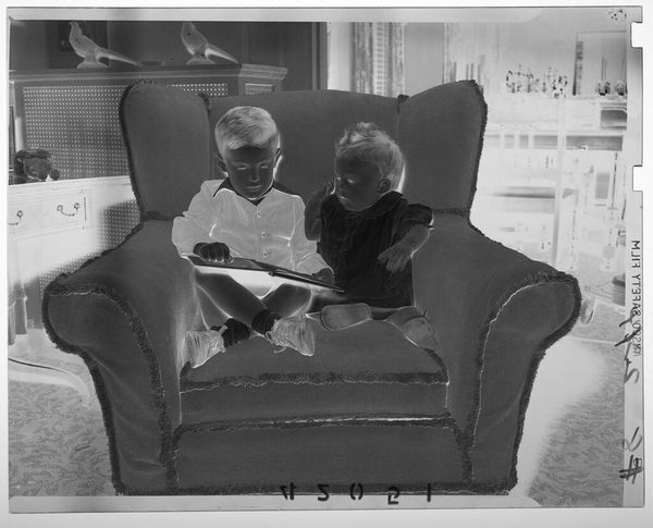 Editor: Here we have "Untitled (two men sitting on couch)" by Peter James Studio. The dimensions are roughly 5 by 4 inches. It feels so staged, yet intimate. What do you see in this piece from a formalist perspective? Curator: The composition is meticulously balanced, wouldn't you agree? Note how the two figures create a symmetry, disrupted only by the subtle variations in their postures. The stark contrast highlights the interplay of light and shadow, lending the image a certain depth. Editor: So you are looking more at the tonal relationships than anything else? Curator: Precisely. It's less about who these men are and more about the formal relationships within the frame. The negative space above them is equally important, contributing to the overall visual dynamic. Have you noticed the geometry of their suits? Editor: It's true, focusing on those elements allows us to separate the work from its historical context. Thanks! Curator: My pleasure. Examining the formal elements reveals the artist's calculated approach to image-making.
