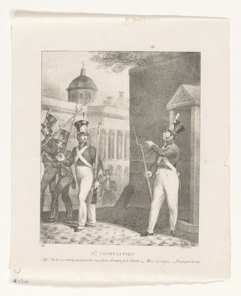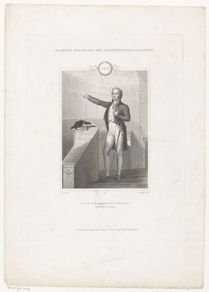 Editor: So here we have "Portret van Étienne-Maurice Gérard," made in 1831 by Pierre Michel Adam, it looks like an engraving. It feels… official, like a carefully constructed image of power, yet the lines are delicate. What strikes you when you look at this piece? Curator: Ah, yes. Immediately, I’m struck by the tension—the rigid pose of Gérard juxtaposed with the rubble around him. He’s so clearly meant to project authority and stability. It’s almost theatrical, isn't it? Look how his sword mirrors the line of the French flag behind him. That intentional mirroring, it’s pure visual rhetoric! It practically screams "leader!" Editor: Rhetoric indeed! So it’s not just a portrait but a statement? Curator: Exactly. Think about where this sits, historically. 1831 – the July Revolution was still fresh. Images like these weren’t just art, they were carefully crafted pieces of political messaging, attempts to shore up power and project an image of unwavering control in a pretty unstable time. Tell me, does that change how you view the 'delicate' lines you noticed? Editor: Definitely. What I initially saw as a softer artistic choice, now feels like a calculated decision to perhaps humanize a figure of authority during a time of upheaval. I’ll definitely think of portraits differently now, considering the context they were created in. Curator: That’s it exactly. To look closely, isn't just to *see* – but to unravel intentions and histories. It’s why I always find myself peering in a historical mirror, whenever art beckons.